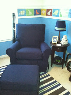 Finally was the chair from PB kids. This chair is amazing and probably the most comfortable thing to sit in. So the chair arrives and we just have to wait on the slip cover. The slip cover arrives and I open the box, and the slip cover is grey. Well...we ordered a navy slip cover. So I call PB and the sales lady tells me that whatever was shipped to me was their color navy and that there was really nothing they could do unless I wanted to exchange it. Jake was out of town and told me to wait till he got back because he didn't want me to do anything rash. So he gets home and confirms what I told him...the slip cover was grey! We head to Lenox the next day to chat with the PB people and they look at us like we are crazy because they knew that was not their navy and that it was grey. Upon further investigation the slip cover was actually a cover for a couch and not a nursery chair. So they exchanged the cover and sent us the navy cover and the chair is AWESOME! Here is a photo of this amazing chair!